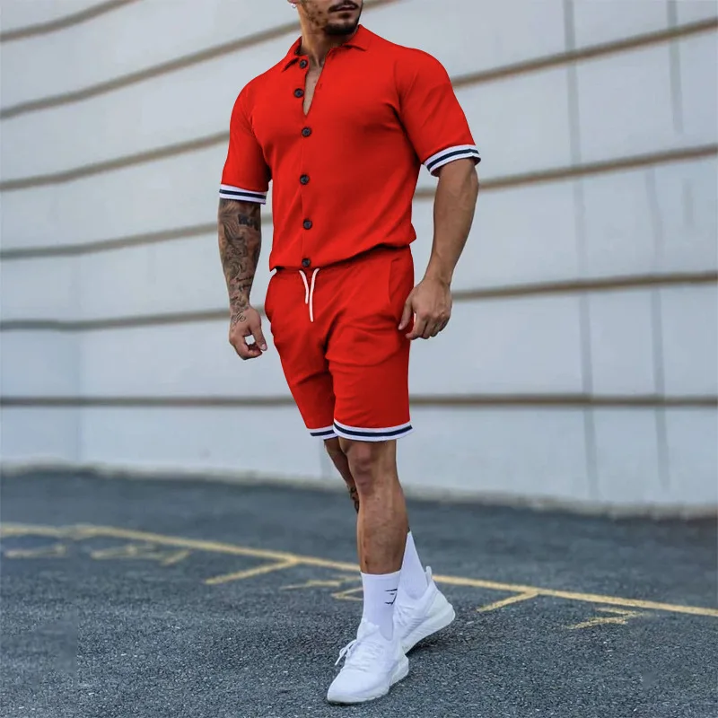Men Short Set Summer Mens Track Suit Sets Custom Logo Solid Color Mens Button Short Sleeve Shirts Shorts Set Two Piece